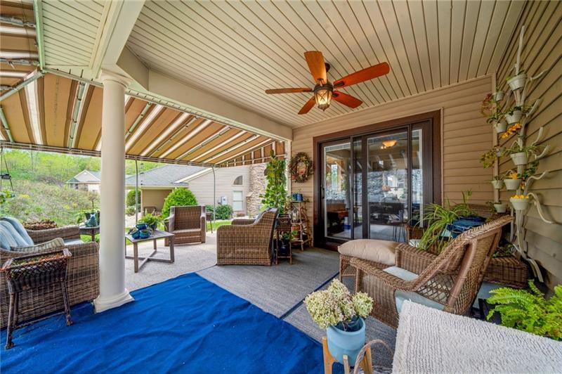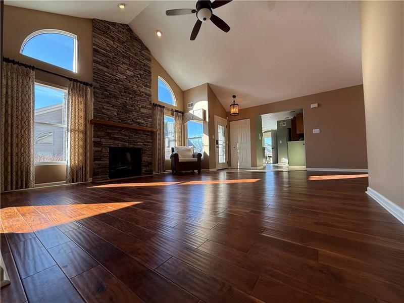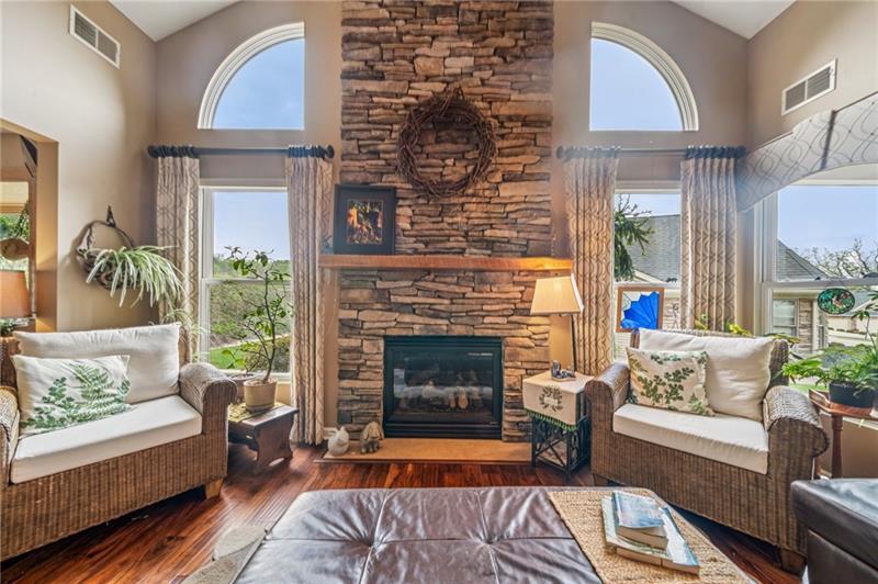 Welcome to this beautifully maintained 2-bedroom, 2-full-bath stone patio home in the quiet community of Grayhawk. The open-concept layout features a spacious dining area and a large living room with soaring cathedral ceilings and a stunning stone gas fireplace. The fully equipped kitchen is a chef's dream, showcasing two-tone KraftMaid cabinets, elegant quartz countertops, a ceramic tile floor, a copper apron sink, and a walk-in pantry and laundry room. Hardwood floors flow through the main living areas, leading you into a versatile den with a large box bay window and sliding glass doors that open to a huge 19x15 patio, complete with an awning. Double doors open to a luxurious master suite, featuring a walk-in closet and a private full bath. A spacious second bedroom and another full bath to accommodate guests or family. 2-car garage with pull down attic storage. Completely updated in 2016 including custom window treatments. Enjoy the convenience of the community pool and club house!